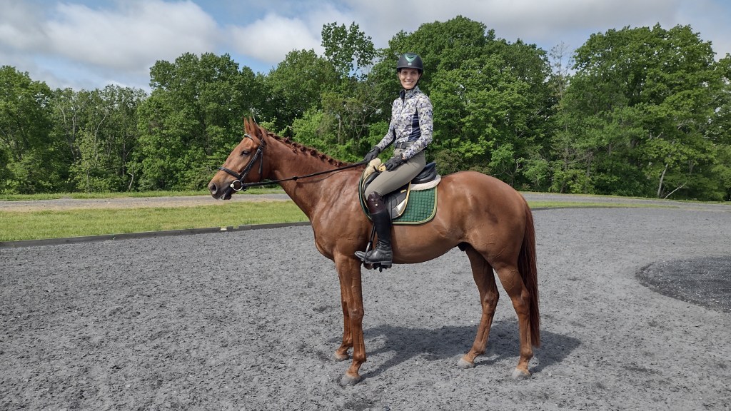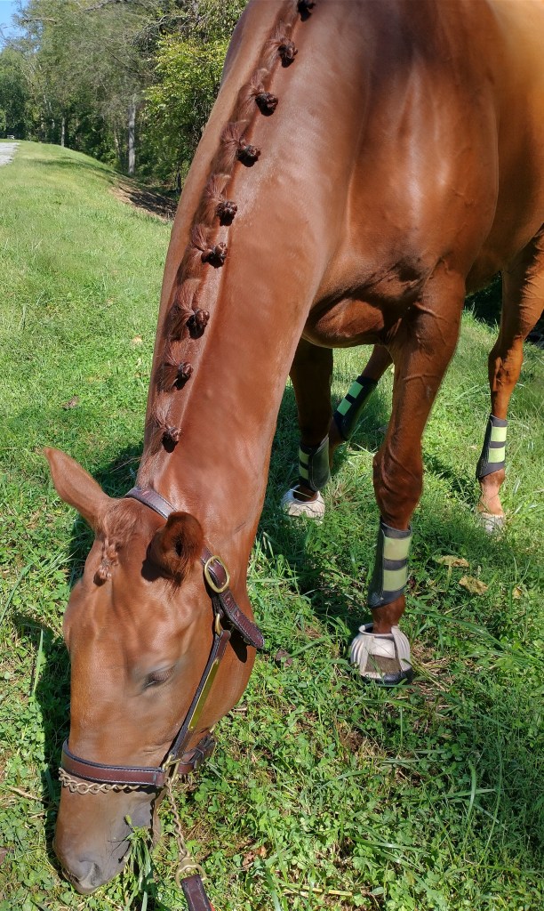 Mac, although initially tense, was able to negotiate a busy warm up ring and experience all the activities that surround warm up areas at recognized events. Mac scored a 70% with a 7.5 for type – the judges’ comments recognized his athleticism and refinement. Mac received a 7.5 for conformation and the comments pointed out his well-set neck, short back and powerful loin. He received a 7.0 for his legs and feet and the judge noticed he is slightly toed out and that his heel angle behind is slightly low ( due to his shoeing at the track). In the under saddle portion she noted some tension which restricted his movement but was overall complimentary.