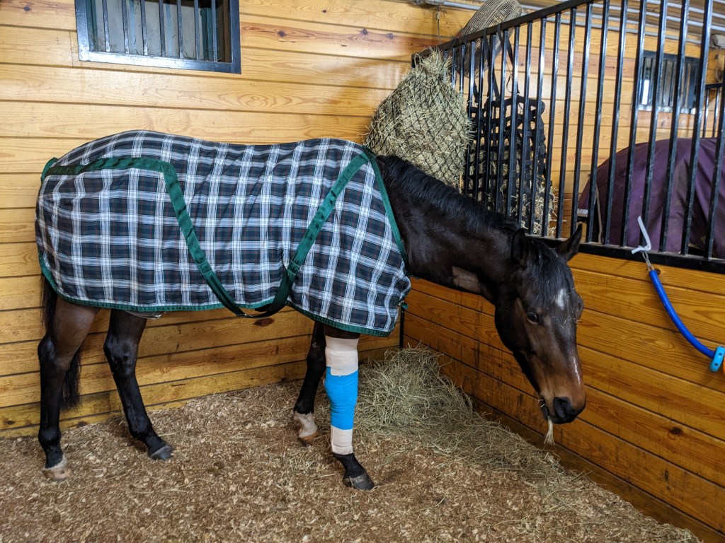 Two days later Mango under went surgery file down this Radial Spike and debride the tendon. Dr Norrie Adams at The Marion Dupont Equine Medical Center performed the surgery and was pleased with the results and recommended 1 month stall rest and one month of turnout before returning to work. He had a bandage for 10 day which was one of the most challenging pars of this process, Without the help of Megan Snyder DVM of Damascus Equine I would not have been able to compete the task. Let just say I REALLY know how to do a knee wrap now.